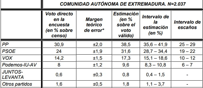 Según la última encuesta del Centro de Investigaciones Sociológicas (CIS), el PP encabezaría los resultados con entre 25 y 29 escaños —insuficientes para mayoría absoluta—; Vox subiría hasta 10–12 escaños; Unidas por Extremadura alcanzaría los 6–7; y el PSOE se quedaría abajo, en torno a 19–22 escaños.