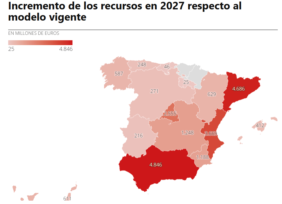 Según las estimaciones iniciales, el nuevo modelo supondría un aumento global de recursos para todas las Comunidades Autónomas del régimen común, aunque con intensidades muy distintas. Algunas comunidades recibirían varios cientos de euros más por habitante, mientras que otras apenas notarían el cambio respecto al modelo anterior.